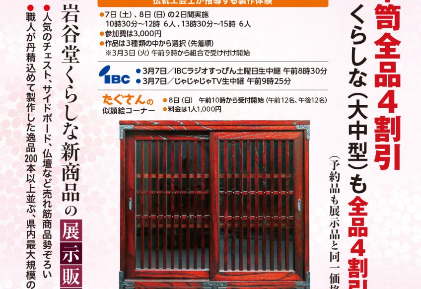 「第22回岩谷堂箪笥まつり」を、3月7日土曜日から3月9日月曜日までの3日間の日程で開催いたします。 □岩谷堂くらしな新商品の展示販売 □人気のチェストのほかサイドボード、仏壇など売れ筋商品が勢ぞろい □職人が丹精込め...